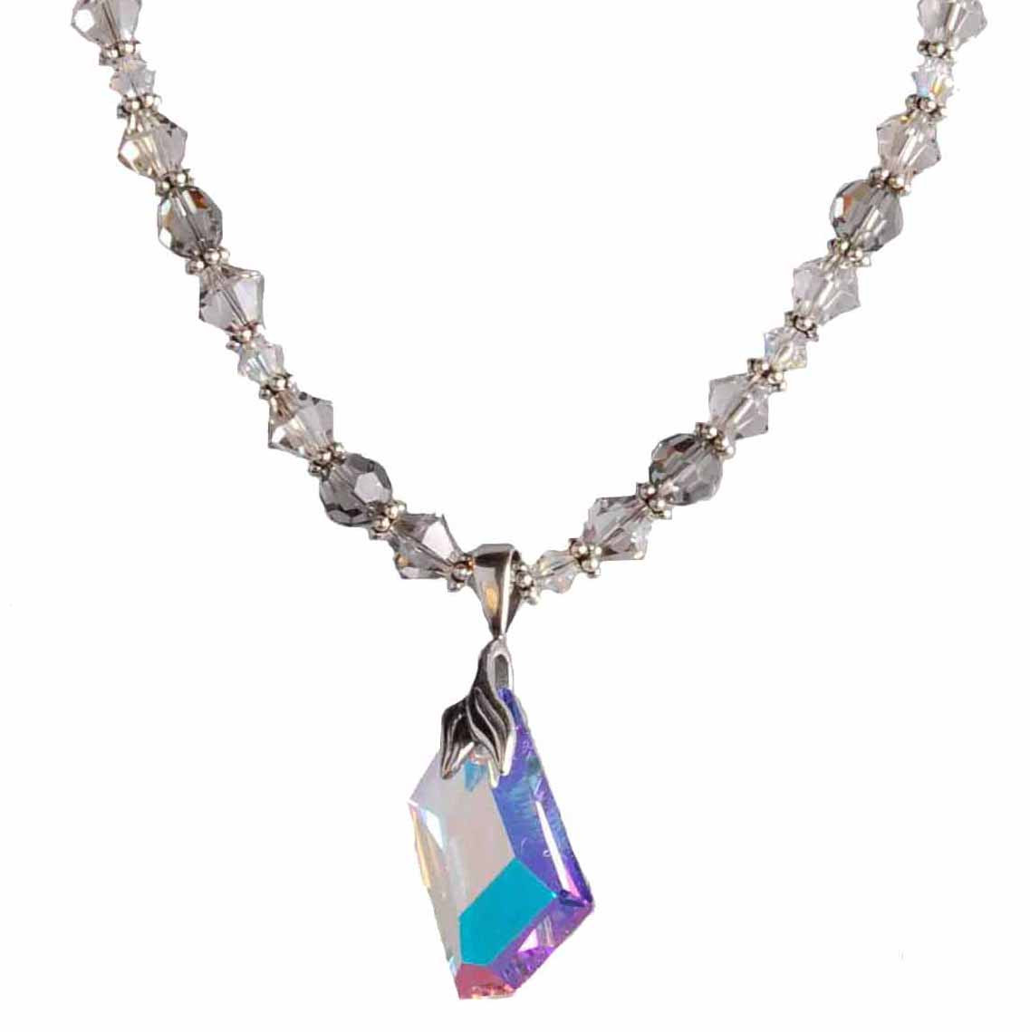 Swarovski crystals in Silver Shade, Black Diamond & Crystal (Clear) with Sterling Silver accents adorned with a Swarovski De-Art pendant in Crystal (Clear). Adjustable 16"-19" with 1" drop.