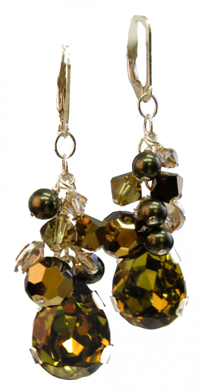 Loading... Please wait...A large Khaki Swarovski Crystal teardrop is clustered in with more Swarovski Crystals in Khaki, Dorado, and Golden Shadow, and a dark green Swarovski Pearl.